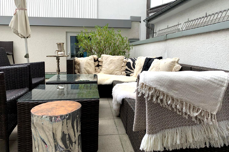 Modernes Ambiente und die einladende Atmosphäre versprechen einen angenehmen Aufenthalt bei uns. Gönnen Sie sich eine kleine Auszeit vom Alltag und lassen Sie sich verwöhnen. Genießen Sie einen Kaffee oder erfrischende Getränke bei angenehmer Musik auf unserer sonnigen Terrasse: Service, Ruhe und Entspannung. | ||||||